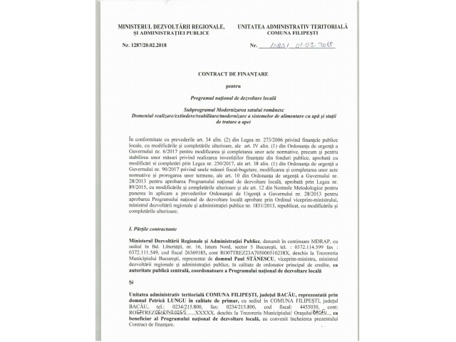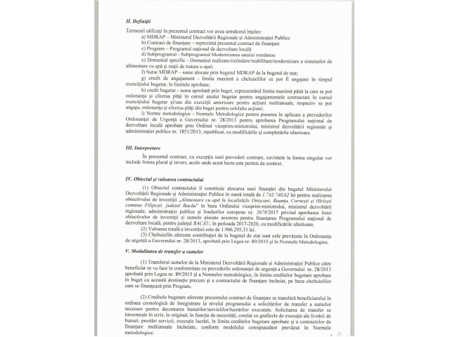 • Alimentare cu apă în localitățile Onișcani, Boanța, Cornești și Hîrlești comuna Filipești, județul Bacău