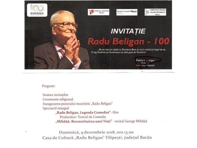 Petrică Lungu - primarul comunei Filipești, vă invită duminică 9 decembrie 2018, ora 13.00 la inaugurarea punctului muzeistic Radu Beligan